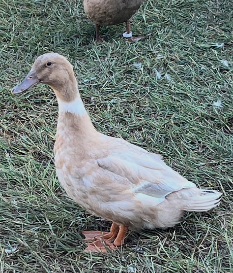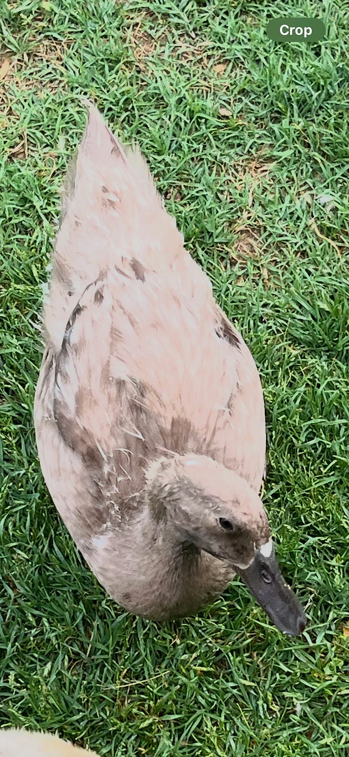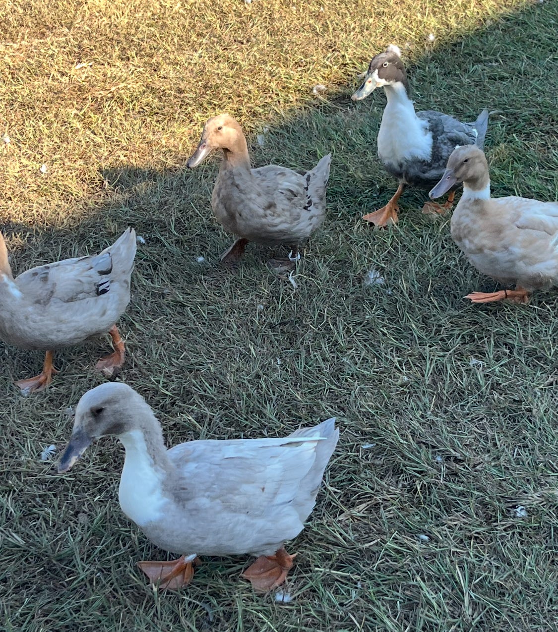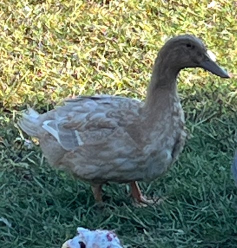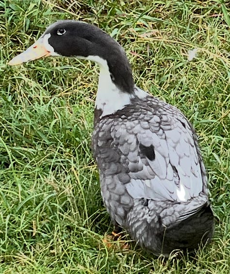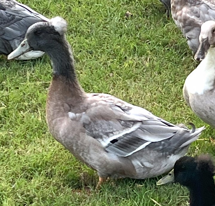 Burnley is the typical Lilac color, perhaps a smidge darker than adults Fio & Raja because she is younger and Black ducks tend to get lighter/white feathers that replace black ones as they age. These Lilacs (all from Buff drake x Cayuga duck) tend to have a brownish tinge to their coloring compared to a Silver Splash duck, which is more of a silver gray. Which brings me to my sweet question mark duckling, Chanel. I originally thought she might be ‘Buff Lilac mallard’ to all of the rest of the females I hatched ‘Buff Chocolate’…or vice versa? But she definitely isn’t Chocolate, and her color is very light silver compared to my Lilacs: